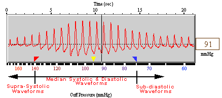 The oscillometric method of blood pressure determination is dependent on pressure changes in the brachial artery as air released from a pressure cuff. The pressure volume coupling between the brachial artery and the cuff is fundamental in the determination of blood pressure. A change in blood pressure within the artery causes a change in volume of the brachial artery due to the elasticity of the vessel. The change in volume of the artery causes a change in volume in the cuff due to the coupling of the cuff to the arm. A sensitive pressure transducer that creates a digital signal detects the corresponding pressure change within the cuff. The signal is displayed as a blood pressure waveform (figure 5) in which blood pressure can be calculated. The waveform is recorded as the cuff pressure deflates from a cuff pressure greater than the systolic pressure to cuff pressure that is less than the diastolic pressure. Although traditional oscillometric methods use the amplitude of the signal to detect the blood pressure, the DynaPulse utilizes pattern recognition. Based on this technique, a new patented algorithm is used to determine the systolic, diastolic, and mean arterial pressure from the non-invasive blood pressure waveform. The single pulse pressure wave (figure 6), which is normalized to the systolic and diastolic pressures, is utilized to examine individual pulse behaviors.